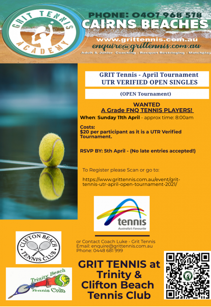 « All Events This event has passed. GRIT TENNIS UTR APRIL OPEN TOURNAMENT 2021 April 11, 2021 $20 « GRIT TENNIS JUNIOR APRIL TOURNAMENT 2021 GRIT TENNIS JUNIOR APRIL HOLIDAY CLINIC 2021 » GRIT TENNIS UTR APRIL OPEN SINGLES 2021 Click here to REGISTER HERE NOW! + Google Calendar+ iCal Export Details Date: April 11, 2021 Cost: $20 Organizers Luke Angus Fred Lay